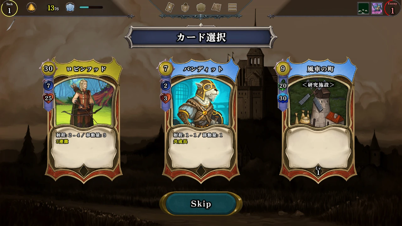 🏰 滅びの世界を、再び導け 魔王に文明を破壊された異世界で、あなたは滅亡寸前の国家の指導者となる。 技術を磨き、資金を集め、人口を増やし、強大な力を持つ魔王に打ち勝て! ⚙️ 技術・資金・人口のバランスが肝 国家を発展させるには、施設を建設し、技術・資金・人口を高めることが鍵。 だが、どれを優先するかで国家の命運は変わる。 ・技術ポイント:一定以上になると新たな技術を獲得し、抽選されるカードの種類が増える。 ・資金ポイント: 資金が多いほど、使えるコイン(コスト)が増える。 ・人口ポイント: 一定以上になるとカードを獲得・アップグレード・削除できる。 今、技術を伸ばすか? 資金を稼ぐか? 人口を増やすか? その一手が、国家の命運を左右する。 🛡️ 迫り来る超魔族 各ステージでは、魔王の配下である超魔族が襲来する。 彼らはじわじわと拠点に迫り、あなたの国を滅ぼそうとする。 施設を建てるか、魔族を撃退するか―― 一手の遅れが、国の滅亡を招く。 だが、適切な選択で超魔族(あるいは魔王)を打ち倒せばステージクリア。 あなたの決断は、人類の未来を切り開く。 🃏 約300種類のカードで戦略を構築せよ 『風車の町』『剣士』『ファイアボール』『活版印刷』といった中世的な技術や魔法から始まり、 技術を発展させることで『戦車』『エクスプロージョン』『レールガン』など、強力なカードを扱えるようになる。 魔法攻撃に特化したデッキで戦うか、中長距離攻撃に特化したデッキで戦うか、近接攻撃に特化したデッキで戦うかはあなた次第。 ただし、敵は手強い。 ・魔法攻撃に強い『魔法鉄壁』 ・中長距離攻撃に強い『スチーム』 ・近接攻撃に強い『飛行』 といった能力(アビリティ)を持つ魔族たちがあなたの行く手を阻む! 敵の能力を読み、デッキを組み替え、勝利の方程式を見つけ出せ! 📺 配信ガイドライン ・個人・法人を問わず、本ゲームは自由に配信できます ・配信にあたり、個別のご連絡は不要です ・収益化も自由に行えます ・ただし、暴力的・性的・差別的など、公序良俗に反する内容を含む配信はご遠慮ください ※本ガイドラインは予告なく変更される場合があります。 変更後に行われた配信については、変更後の内容が適用されます。