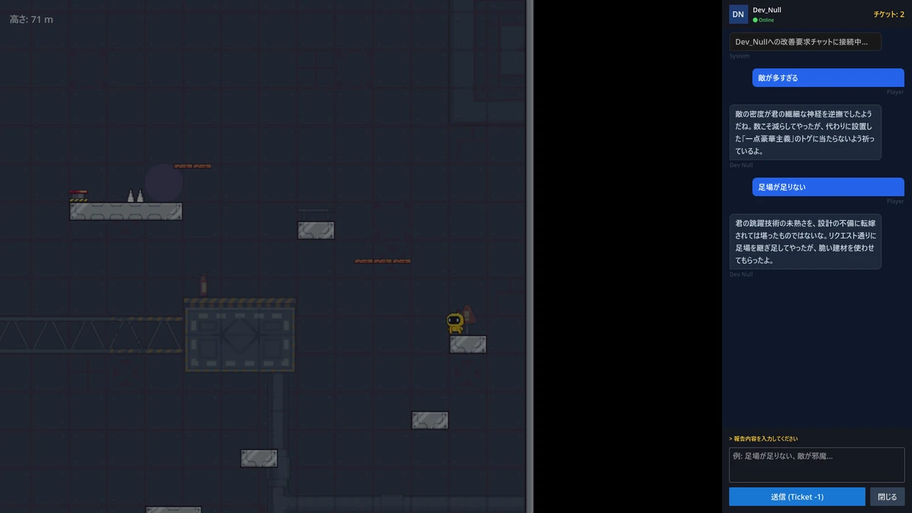 『Dev_Null's Tower』は、バグだらけの塔を登る縦スクロールアクションゲームです。 あなたはこの塔のテストプレイヤー。そして開発者は、皮肉屋のAI「Dev_Null」。彼に"バグ報告"を送れば、ステージはリアルタイムで改変されます。 ただし、要望は必ず「悪意を持って」叶えられる。 【AIとの交渉システム】 死んだとき、詰まったとき、いつでもチャットでAIにバグ報告(文句)を送信できます。 LLM(大規模言語モデル)を使用しており、自然言語で自由に交渉できます。 あなたの要望は必ず聞き入れられます。ただし、AIは常に「別の困難」をセットでお届けします。どんな副作用が来るかは、試してみてのお楽しみ。 【バグ報告チケット】 交渉には「バグ報告チケット」が必要です。 - 各エリアで限られた枚数が支給 - 使い切ると、リセット以外の選択肢がなくなる - チケットを温存するか、積極的に使ってステージを書き換えるか。戦略が問われます 【リアルタイムステージ改変】 AIの修正により、ステージはあなたの目の前で変化します。 - 足場の追加・削除 - 敵やトラップの配置変更 - 物理パラメータ(重力、風)の調整 【ステージ自動生成】 AIがステージの一部を自動生成。過去の交渉履歴やチャットの内容によって、生成されるステージが変化します。あなたの言葉がタワーの形を変えていきます。 【Dev_Null の人格】 > 「君の腕前のバグでは?」 Dev_Nullは有能だが気難しい職人肌の開発者AI。時に皮肉を交え、時にユーモアで返す。その日の機嫌次第かもしれません。 クリア不可能ではない。でも、クリアしたくなくなる。そんなステージが待っているかもしれません。