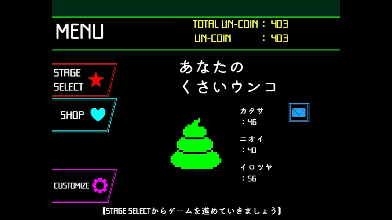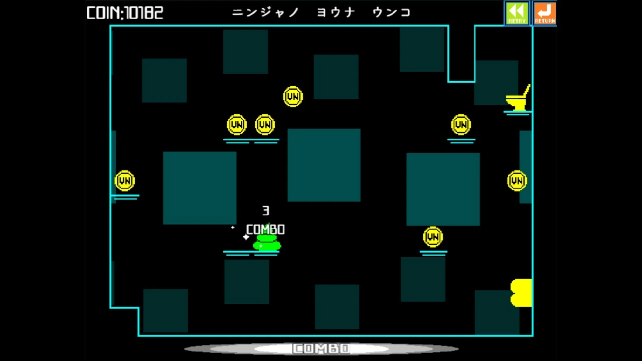 レトロネオン調のグラフィック&クールなサウンドを堪能しながら 自動走行するウンコをジャンプさせてゴールの便器に導くスタイリッシュウンコアクション。