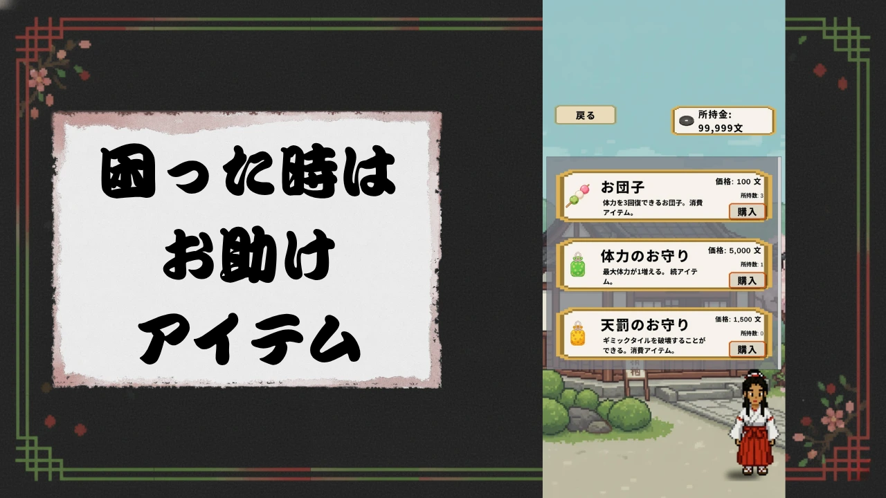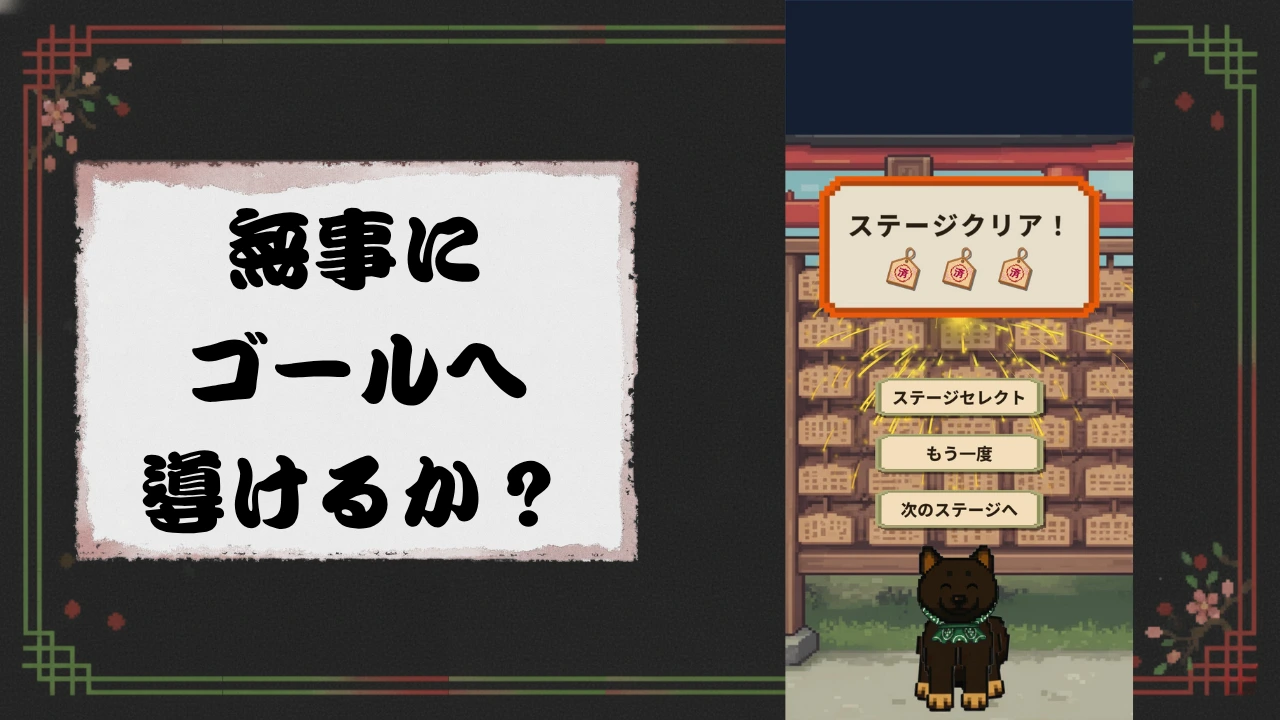 病気やケガのご主人の代わりにお参りへ。 江戸時代に実在した「おかげ犬」の物語。 和風の世界を旅するわんこを、あなたの指で導く一筆書きタイルソートパズルゲーム。 道を一筆書きでつなぎ、迷路のようなタイルをロジックと脳トレ感覚で解き進めていきましょう。 ドット絵の世界で、犬が懸命に進む姿を見守りつつ、「導いている」手触りが感じられるよう、細かなゲーム演出にもこだわりました。 <特徴> ・癒しのドット絵 スーパーファミコン時代を彷彿とさせる、懐かしくも温かいピクセルアート ・脳を刺激する一筆書き シンプルだけど奥が深い、タイルの配置ロジック ・旅のギミック 立ち寄る茶屋や、行く手を阻むギミックなど、ステージごとに異なる楽しさ <遊び方> 1. 手札タイル(道)を選ぶ 画面下部に表示される「道タイル」をタップします。 手札は道の種類ごとに数が決まっており、使うと残り枚数が減っていきます。 2. 盤面のマスをタップして道を設置 手札を選んだ状態でパズルボードのマスをタップすると、道タイルを設置できます。 また、長押しすると、ギミックタイルの説明を見ることができるので、道順を考えましょう。 3. 道がつながると犬が進む 道を置くと、道が繋がっている方向に犬が進みます。 4. ギミックタイルへの移動 ステージには最初から置かれた「ギミックタイル」が存在します。 新しく置いた道がギミックに繋がると、犬はそのギミックへ進み、様々な効果を受けることになります。 5. 体力に注意してゴールを目指す 犬は移動するたびに体力を消費します。 体力が0になる前に、ゴールに到達できればステージクリアです。
