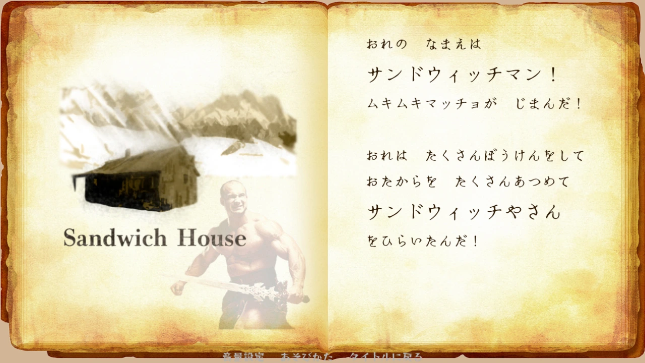 ムキムキの戦士が雄叫びを上げながらサンドウィッチを作る、かんたんタイピングアクション!! タイピングは決まった5つのキーしか使わないシンプル操作な分、反射神経が問われます! 伝説のサンドウィッチマンは大声で叫ぶので、負けないぐらいでっかい声を出してくださると嬉しいです! ストーリーモードは短いノベル+タイピングで3分、おこさまモードも遊ぶなら合計6分程度! ストーリーモードをクリアすると解放されるタイムアタックもあります。