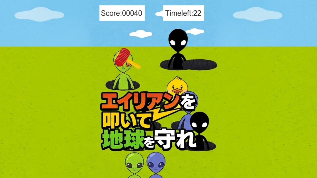 宇宙からやってきたエイリアン達が、地球の平和を脅かそうとしている。 あなたの使命は、次々に穴から飛び出してくるエイリアン達を、 ハンマーで叩きまくって撃退すること!