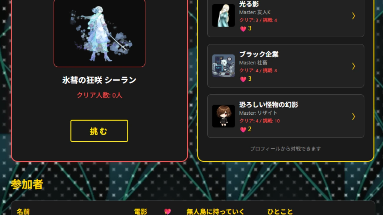 孤独な少女と、無人島の秘密。 頼れるのは、君の閃き《スキル》だけ。 『紫電一閃』とは、ひとりで遊べるブラウザベースのノンフィールドRPGです。 やることは、スキルをポチポチ選ぶだけ。 相手のスキルを全て破壊したら勝利だ! 単純だけど奥が深い。難しくても触りたくなる。 並み居る敵と切り結び、絶海の孤島を生き抜こう。 第2章「FLAG」鋭意制作中!