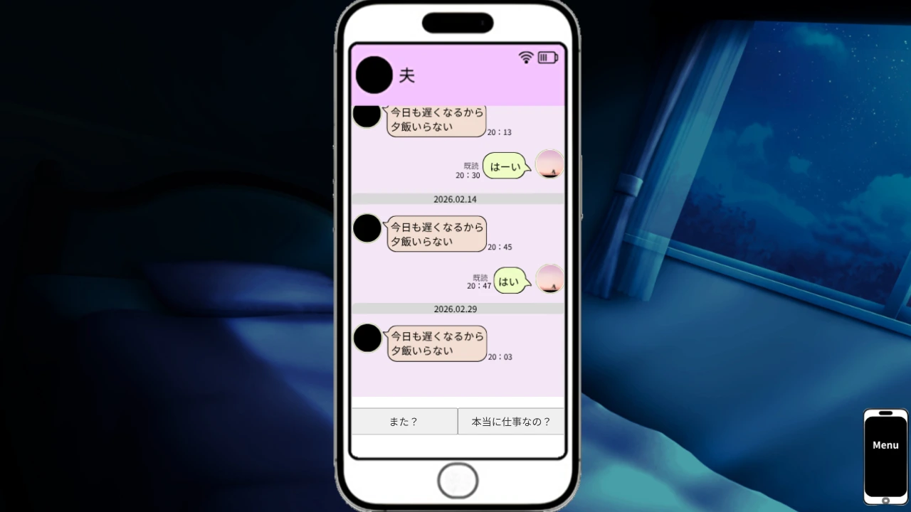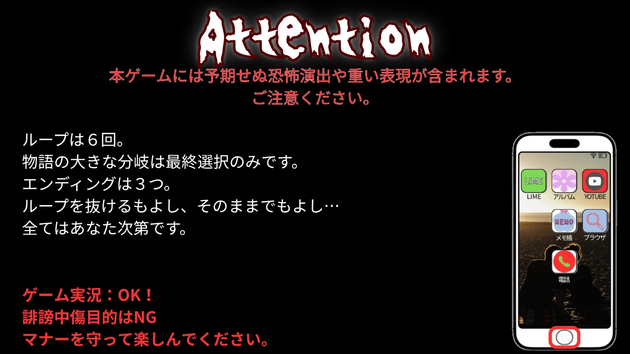 【ゲーム概要】 繰り返される「2月29日」 どれだけ眠っても、どれだけ願っても、望む明日は来ない。 LIME、写真、メモ帳…。 手の中のスマートフォンに残された「執着」の痕跡を辿り、ループし続ける時間の正体を突き止めるスマホ風UI・タイムループホラーノベル。 【あらすじ】 繰り返される「2月29日、20時」 夫から届くのは、いつもと同じLIME。 「今日も遅くなるから夕飯いらない」 不信感、すれ違い、そしてスマホを駆け巡る不気味なノイズ。 ループの度に書き換えられていく「現実」の果てに、あなたは何を思い出すのか。 この世界から抜け出したその先は… 【本作の特徴・注意】 ・没入型スマホUI:一部アプリはスクロールが可能です。全てのアプリを確認することで、強制的にイベントが進行します。イベント発生後はアプリの確認が出来なくなります。 ・謎解き:一部簡単な謎解きがありますが、ループ時にヒントが消えてしまいます。 メモを取るか、セーブ機能を活用して進めてください。 謎解きは解けなくてもゲームは進められますが、暗証番号入力を強くお勧めします。 謎解き後、ループをしても暗証番号は変わりませんが、中身が変化している場合があります。 ・物語の分岐:ループは全6回。大きな分岐は最終選択のみです。(ENDは3つ) ・変貌する演出:ループを重ねるごとに、画像や文字がノイズと共に崩壊していくホラー演出が含まれます。 ※注意:本ゲームには予期せぬ恐怖演出や一部、重い表現が含まれます。苦手な方はご注意ください。 R12推奨 【実況・生放送について】 大歓迎します!事前連絡も基本不要ですが、ご連絡いただけると喜んで見に行きます! 概要欄にこのページURL、または作者名「すずはるひろみ」を記載いただけると嬉しいです。 ※誹謗中傷目的はNG。マナーを守ってお楽しみください。 【プレイ時間】 1周 約10分〜15分(全エンディング3つ、回収まで 20分〜30分) 【こんな人におすすめ】 ・ホラーが好き ・簡単なミステリーが好き ・情緒的な物語を楽しみたい方 ・考察が好き ・スマホ操作風のギミック、探索が好き ・ループものが好き ・さくっと遊びたい方 【使用素材】 使用素材(BGM) DOVA-SYNDROME様 レンサ table_1様 越えられない壁 ゆうり(Yuli Audio Craft)様 使用素材(SE) 効果音ラボ様 On-Jin ~音人~様 ノタの森様 使用素材(背景) みんちりえ様 少年舎様 使用素材(イラスト・素材) CANVA様 イラストAC様 photoAC様 ニコニ・コモンズ様 【免責事項】 個人の創作活動による作品のため、動作保証はございません。 ご自身の責任でご利用ください。